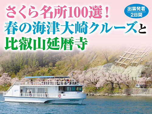 NEW さくらの名所100選! 春の海津大橋クルーズと比叡山延暦寺2日間 出発日:令和8年4月5日(日)・4月10日(金) 旅行代金:59,800円(3~4名1室利用・税込) ツアー詳細を見る(PDF)