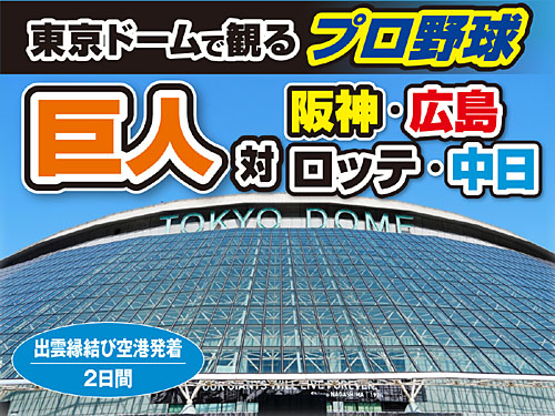 NEW 東京ドーム野球観戦ツアー2日間 出発日:令和8年5月23日(土)巨人対阪神 指定席C令和8年6月5日(金) 巨人対ロッテ 指定席B令和8年6月19日(金)巨人対中日 指定席C令和8年8月21日(金)巨人対広島 指定席B 旅行代金:69,800円~74,800円(2名1室利用・税込) ツアー詳細を見る(PDF)