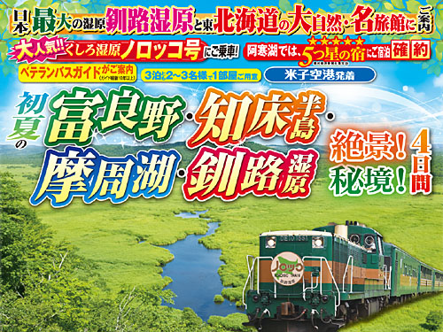 NEW くしろ湿原ノロッコ号に乗車 初夏の富良野・知床半島・摩周湖・釧路湿原4日間 出発日:令和8年6月3日(水)・7日(日)・10日(水)・17日(水)・22日(月)・27日(土) 旅行代金:196,800円(2~3名1室利用・税込) ツアー詳細を見る(PDF)